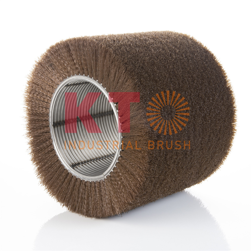 The brush strips are wound in a helical or spiral pattern around a central core or shaft. This design allows for efficient and uniform brushing across surfaces.